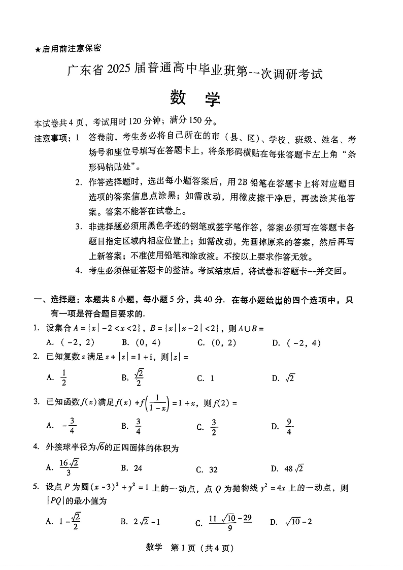 广东省2024-2025学年高三上学期毕业班第一次调研考试+数学
