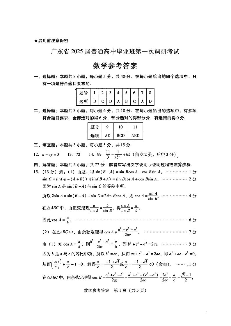 广东省2024-2025学年高三上学期毕业班第一次调研考试+数学答案