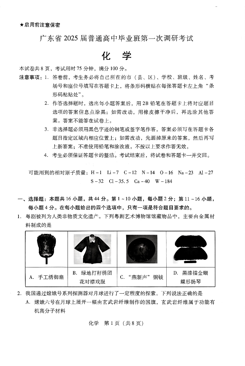 广东省2024-2025学年高三上学期毕业班第一次调研考试+化学