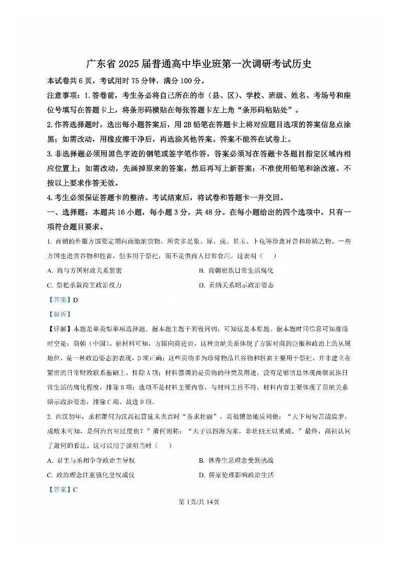 广东省2024-2025学年高三上学期毕业班第一次调研考试+历史答案