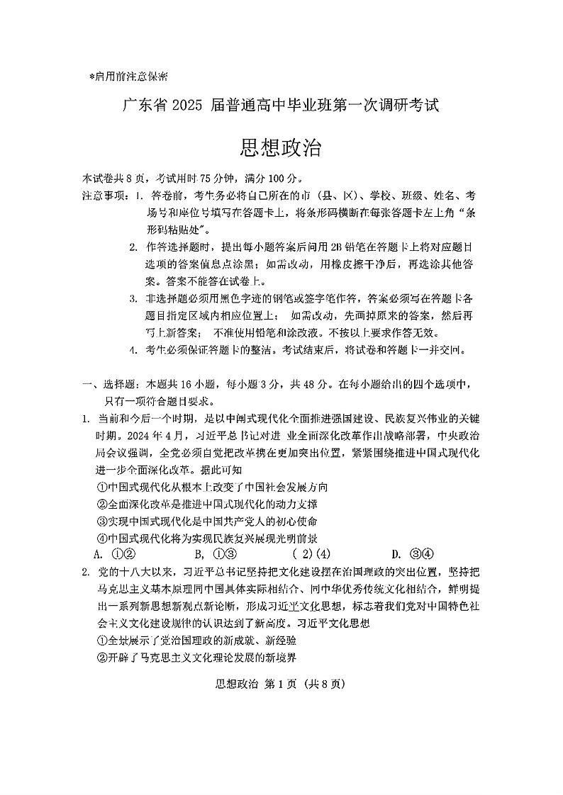 广东省2024-2025学年高三上学期毕业班第一次调研考试+政治