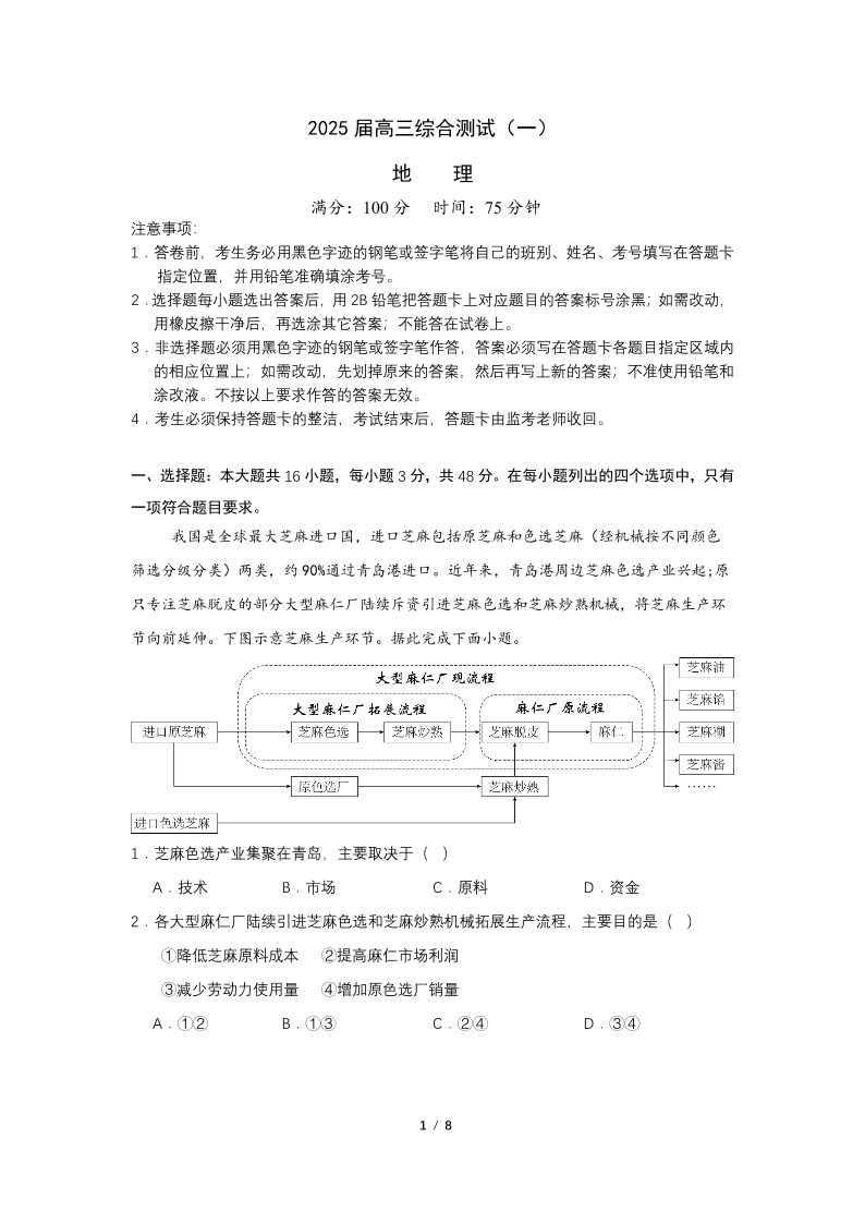 广东省华南师范大学附属中学2025届高三综合测试(一)地理