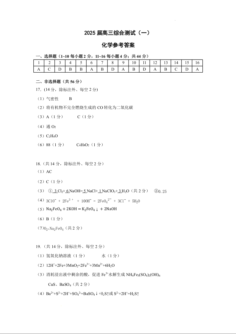 广东省华南师范大学附属中学2025届高三综合测试(一)化学答案