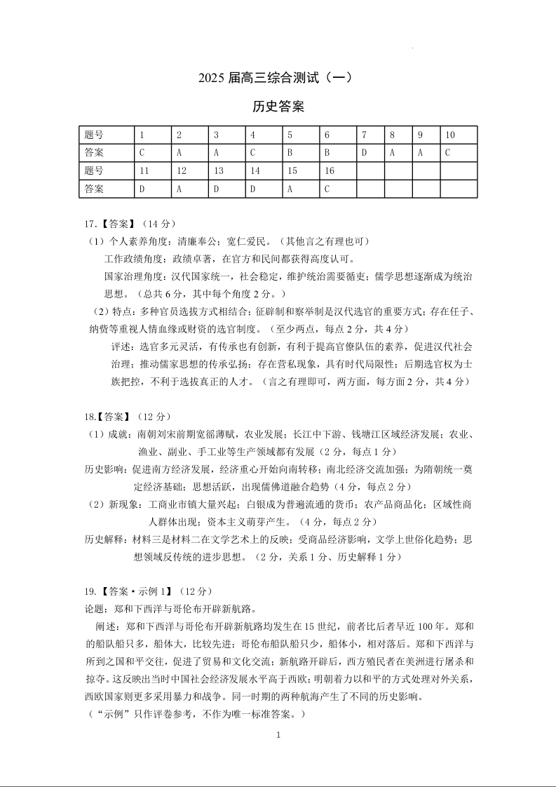 广东省华南师范大学附属中学2025届高三综合测试(一)历史答案