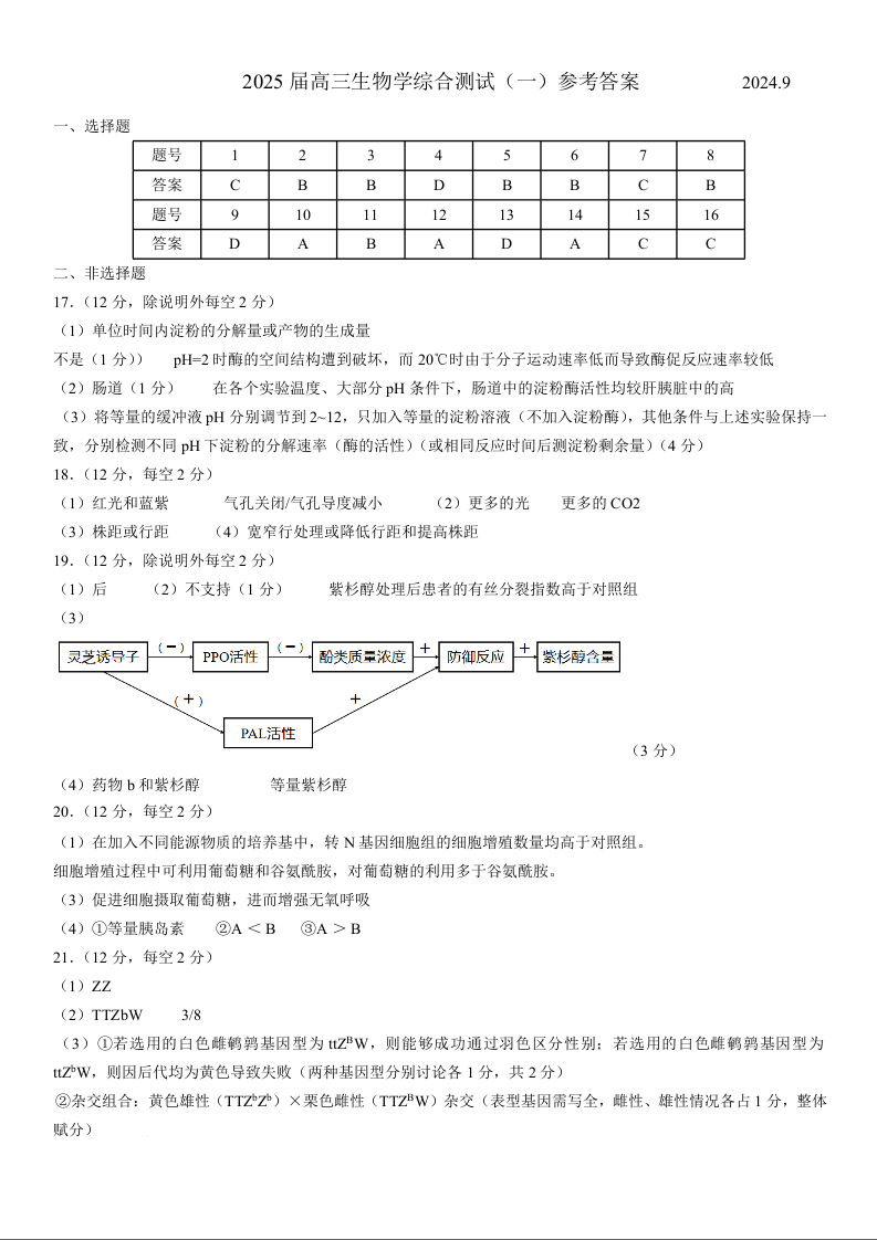 广东省华南师范大学附属中学2025届高三综合测试(一)生物答案