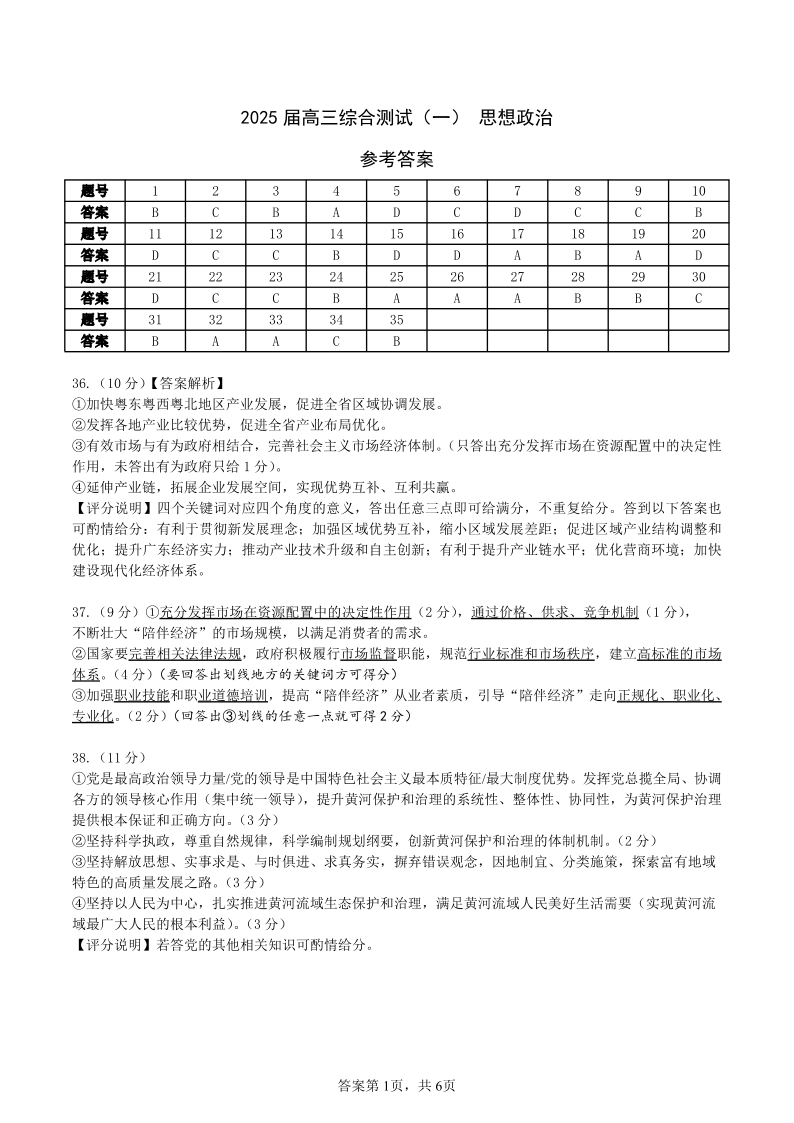 广东省华南师范大学附属中学2025届高三综合测试(一)政治答案