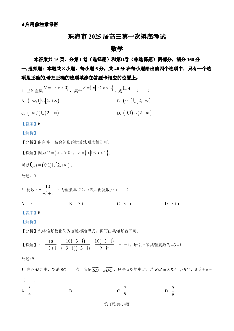 广东省珠海市2024-2025学年高三上学期第一次摸底考试+数学答案