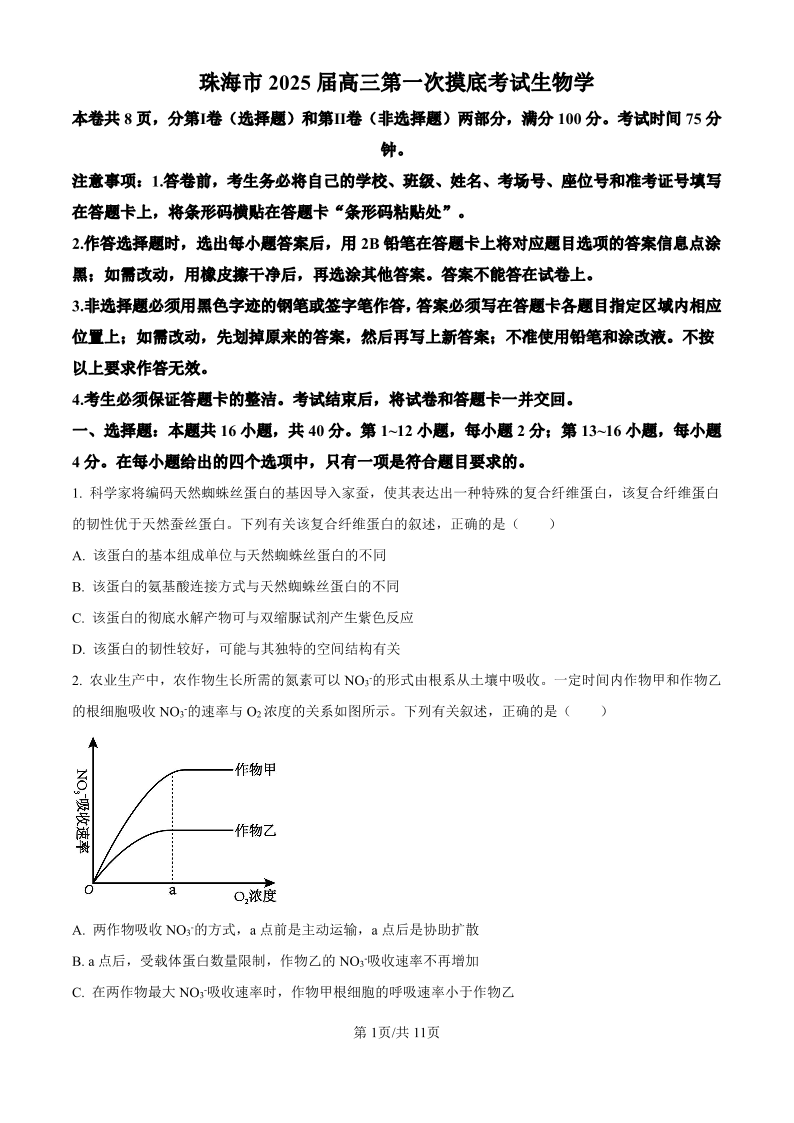广东省珠海市2024-2025学年高三上学期第一次摸底考试+生物