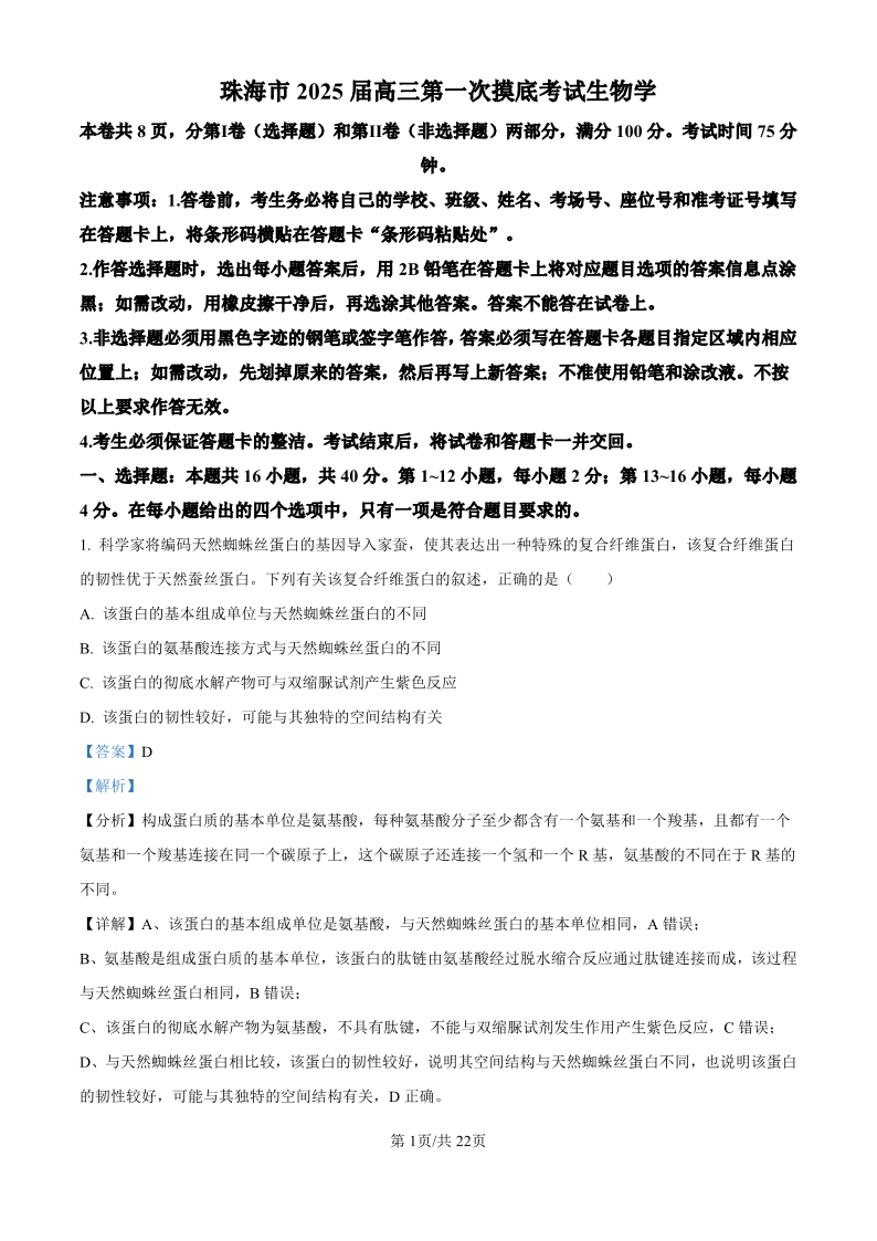 广东省珠海市2024-2025学年高三上学期第一次摸底考试+生物答案