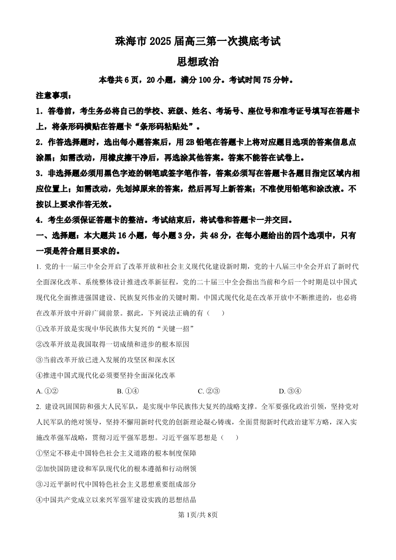 广东省珠海市2024-2025学年高三上学期第一次摸底考试+政治