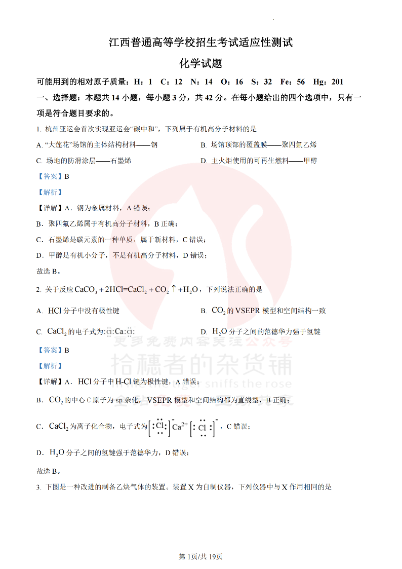 2024年1月江西普通高等学校招生考试适应性测试化学试题(解析版)