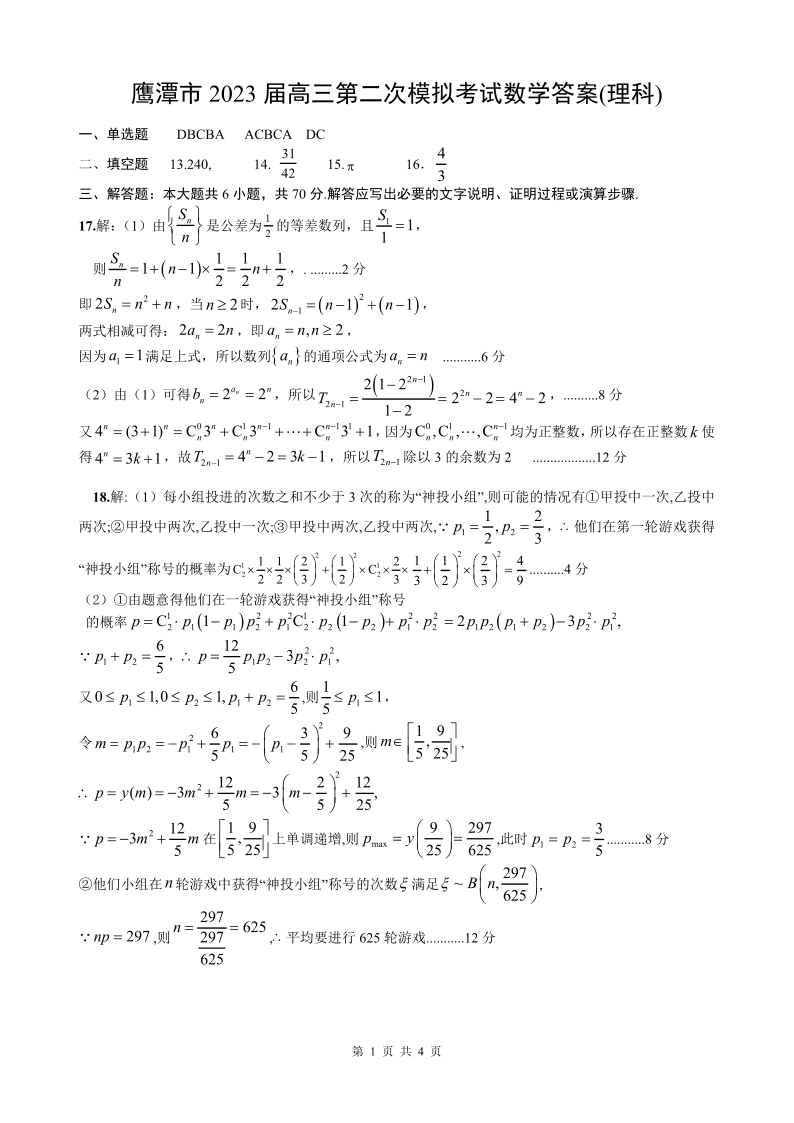 鹰潭市2023届高三第二次模拟考试 理数答案
