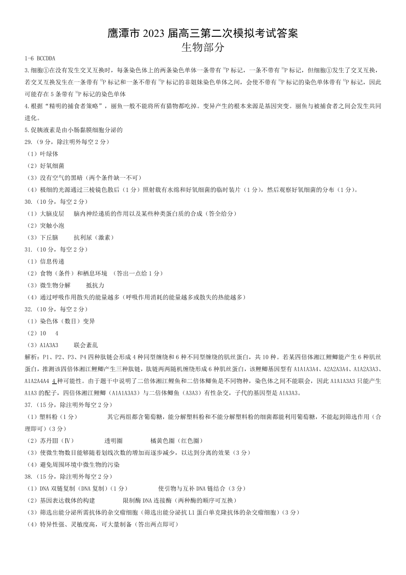 鹰潭市2023届高三第二次模拟考试 理综答案