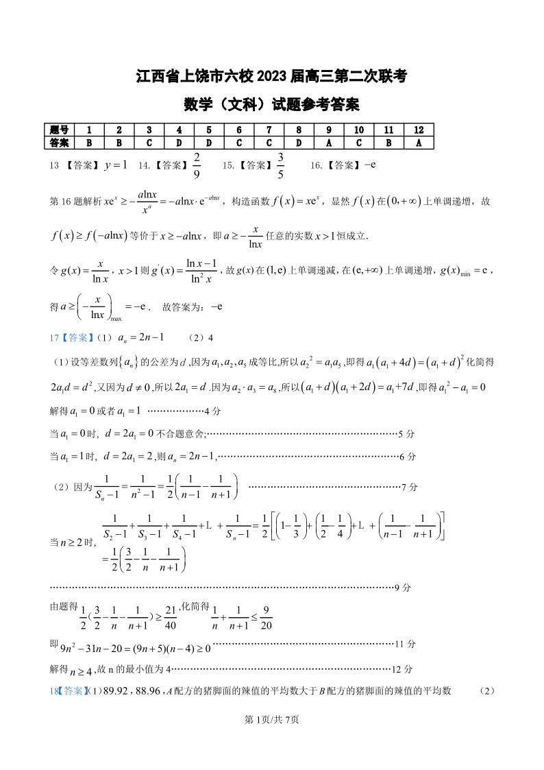 江西省上饶市六校2023届高三第二次联考 文数答案