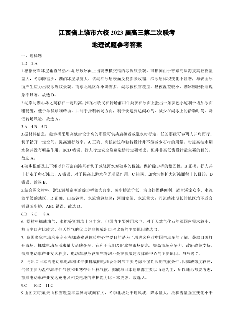 江西省上饶市六校2023届高三第二次联考 文综答案