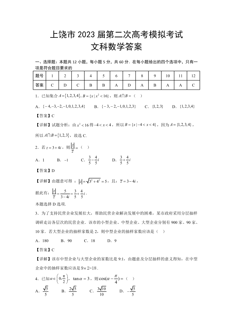 上饶市2023届第二次高考模拟考试 数学(文科)答案