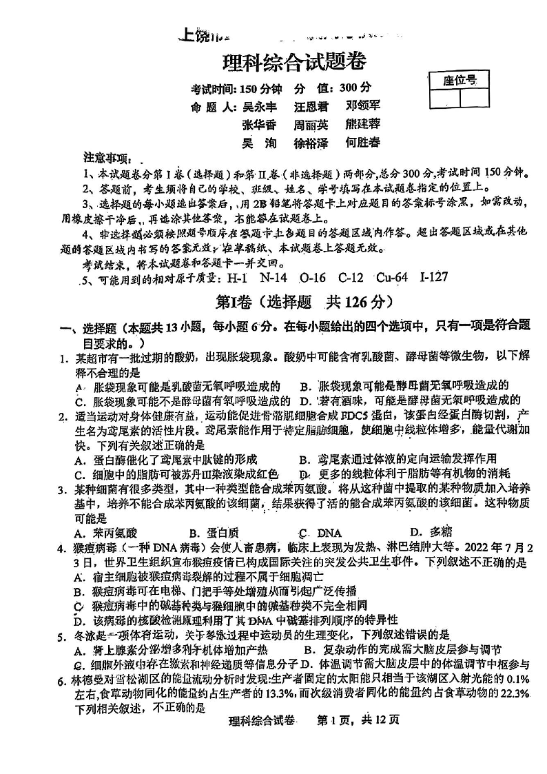 上饶市2023届第二次高考模拟考试 理综
