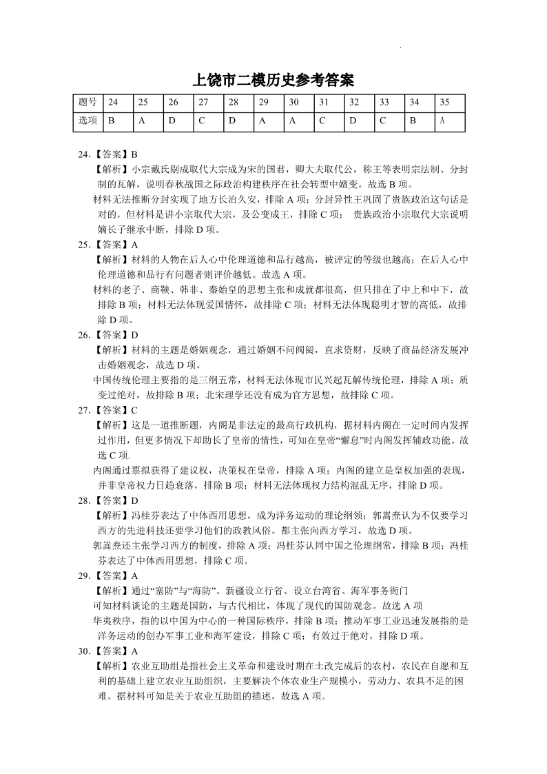 上饶市2023届第二次高考模拟考试 文综历史答案