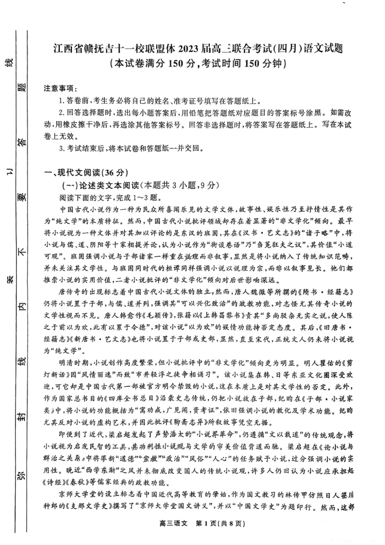 江西省赣抚吉十一校联盟体2023届高三4月联考 语文