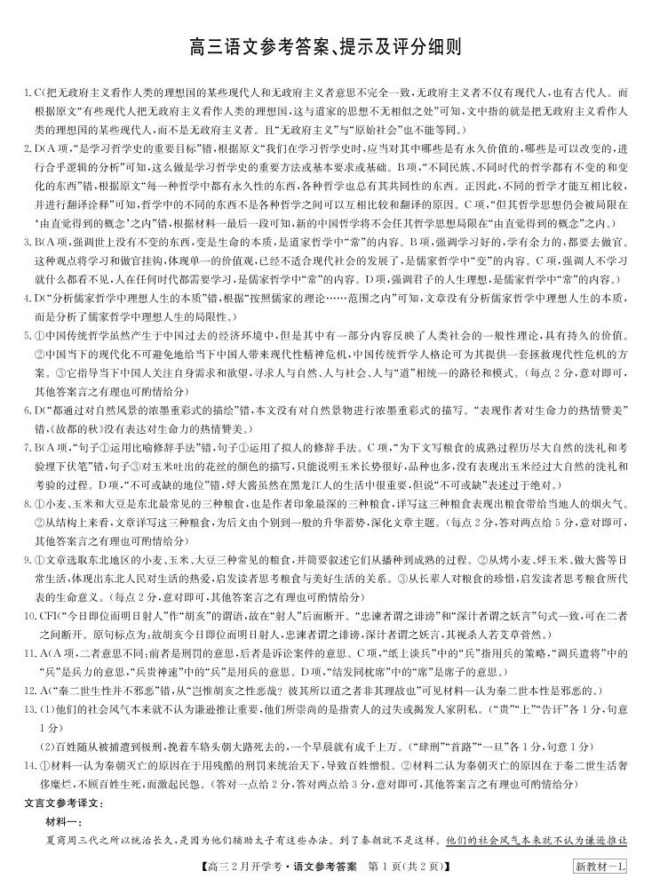 九师联盟2023-2024学年下学期高三2月开学考试 语文答案