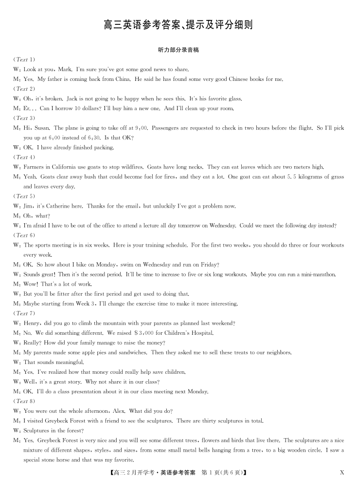 九师联盟2023-2024学年下学期高三2月开学考试 英语答案