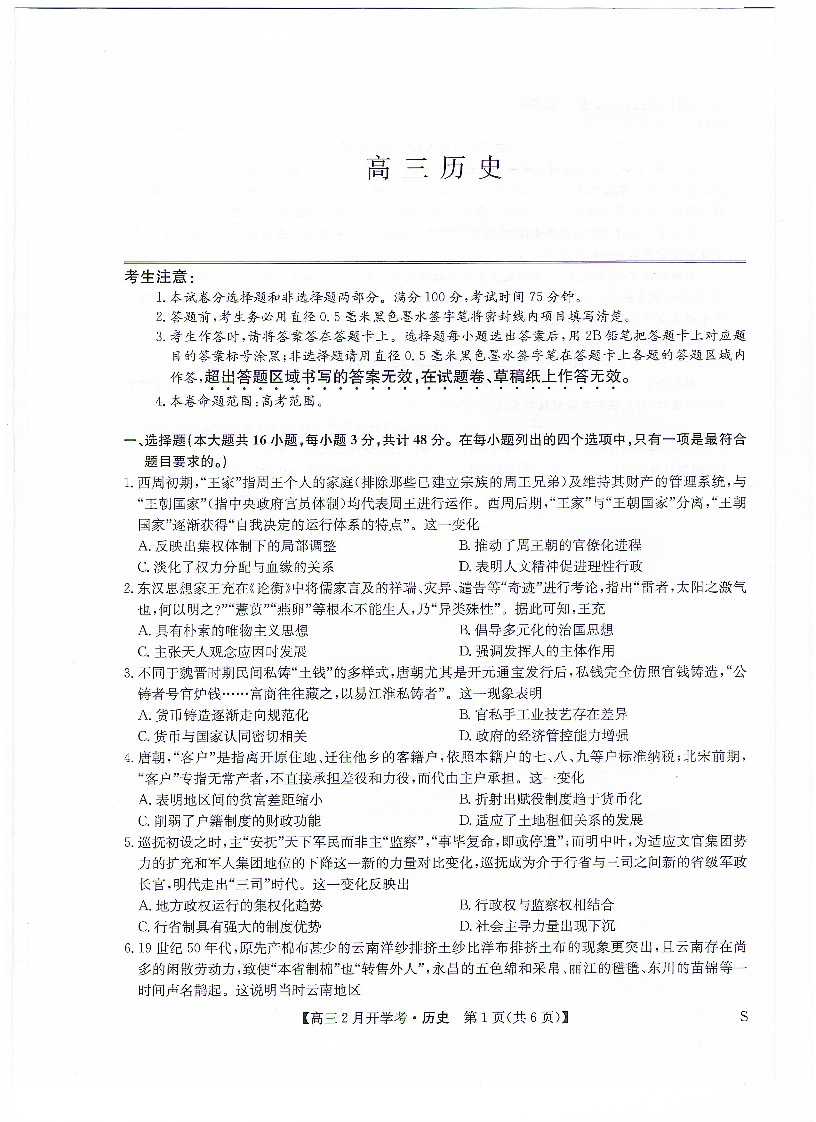 九师联盟2023-2024学年下学期高三2月开学考试 历史