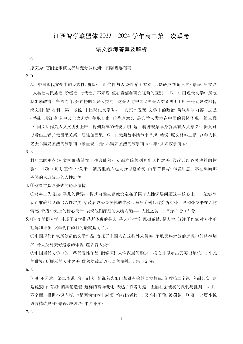 江西智学联盟体2023-2024学年高三第一次联考 语文答案