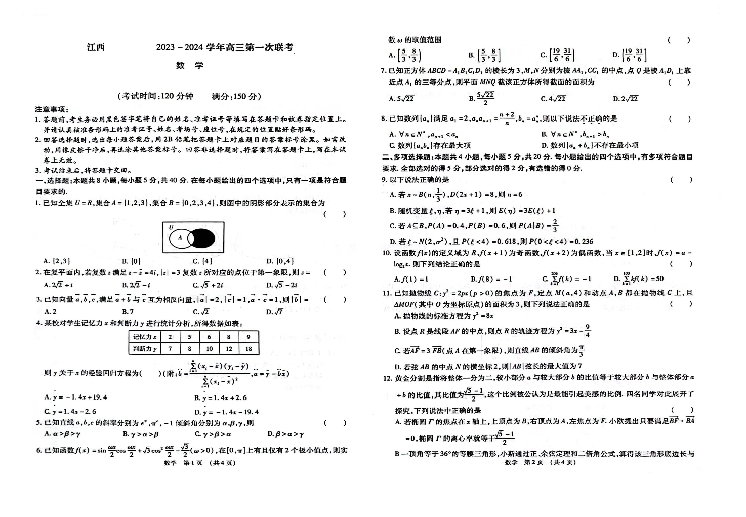 江西智学联盟体2023-2024学年高三第一次联考 数学