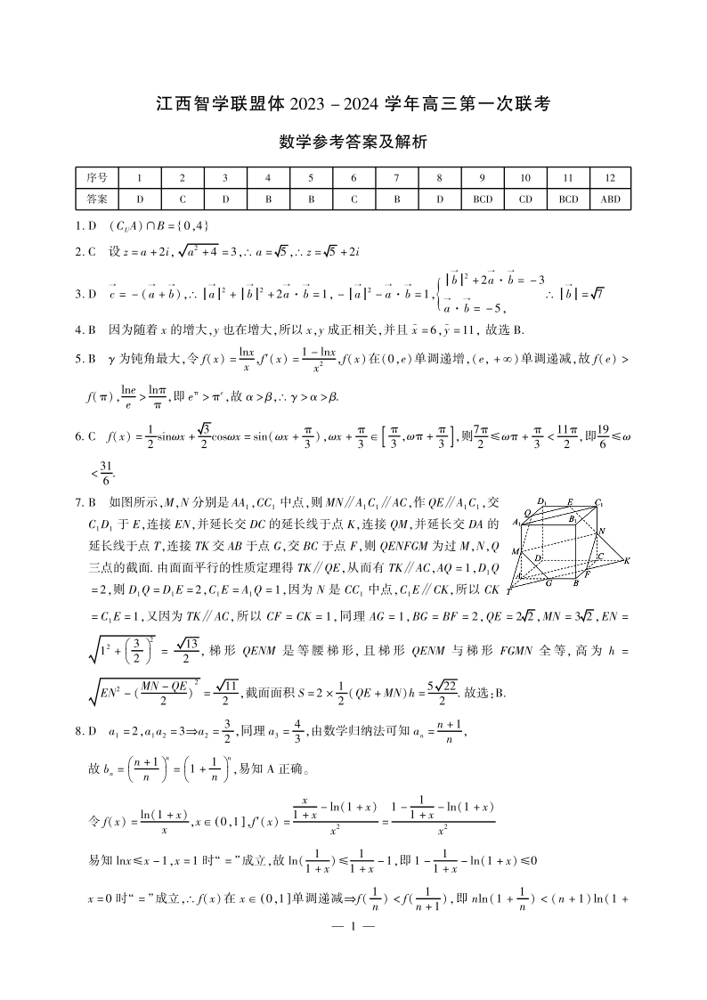 江西智学联盟体2023-2024学年高三第一次联考 数学答案