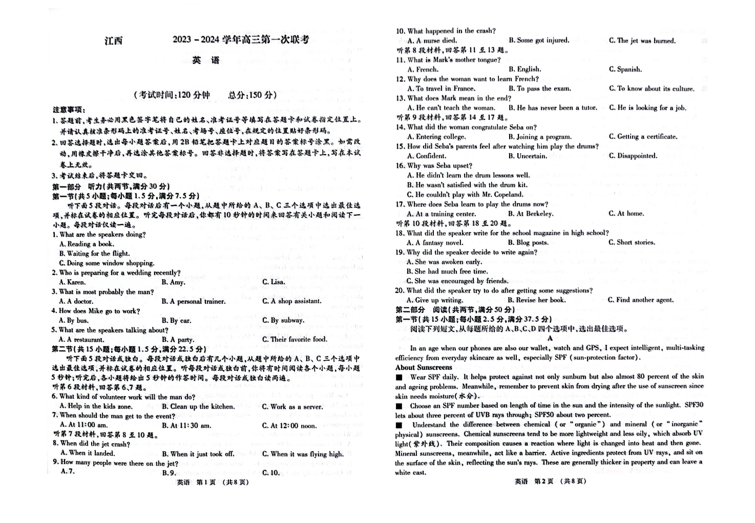 江西智学联盟体2023-2024学年高三第一次联考 英语