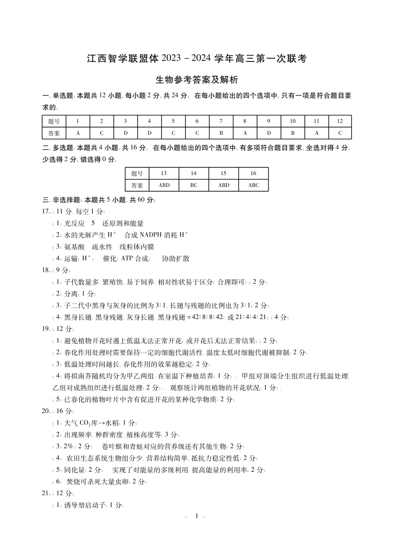 江西智学联盟体2023-2024学年高三第一次联考 生物答案