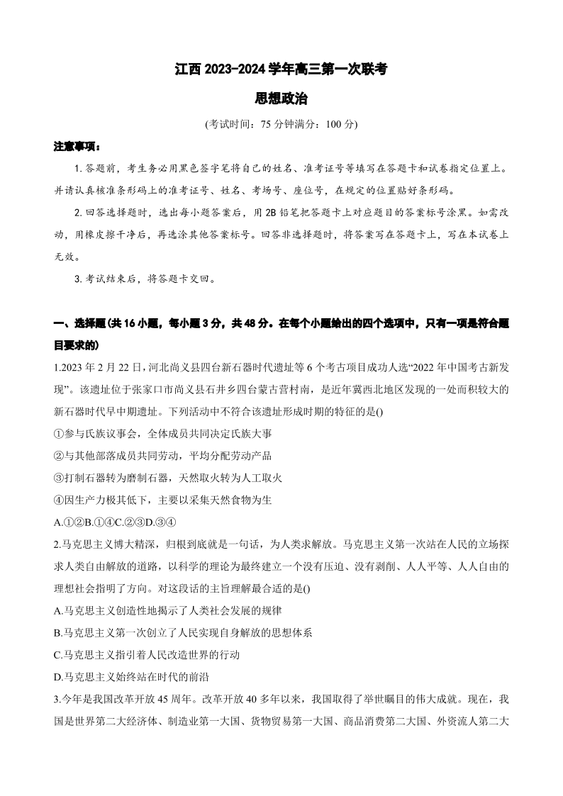 江西智学联盟体2023-2024学年高三第一次联考 政治