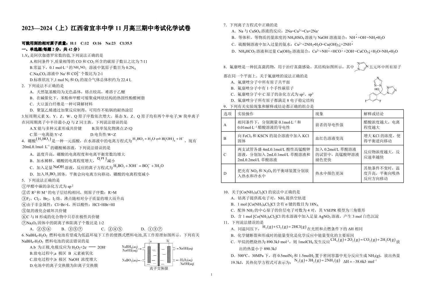 江西省宜丰中学2023-2024学年高三上学期11月期中考试 化学