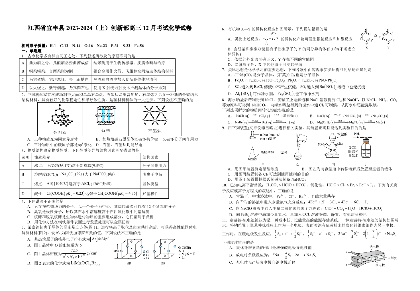 江西省宜春市宜丰中学2024届高三上学期12月月考 化学