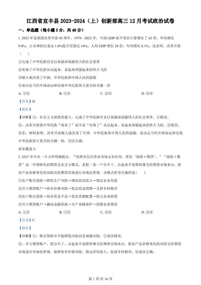 江西省宜春市宜丰中学2024届高三上学期12月月考 政治答案