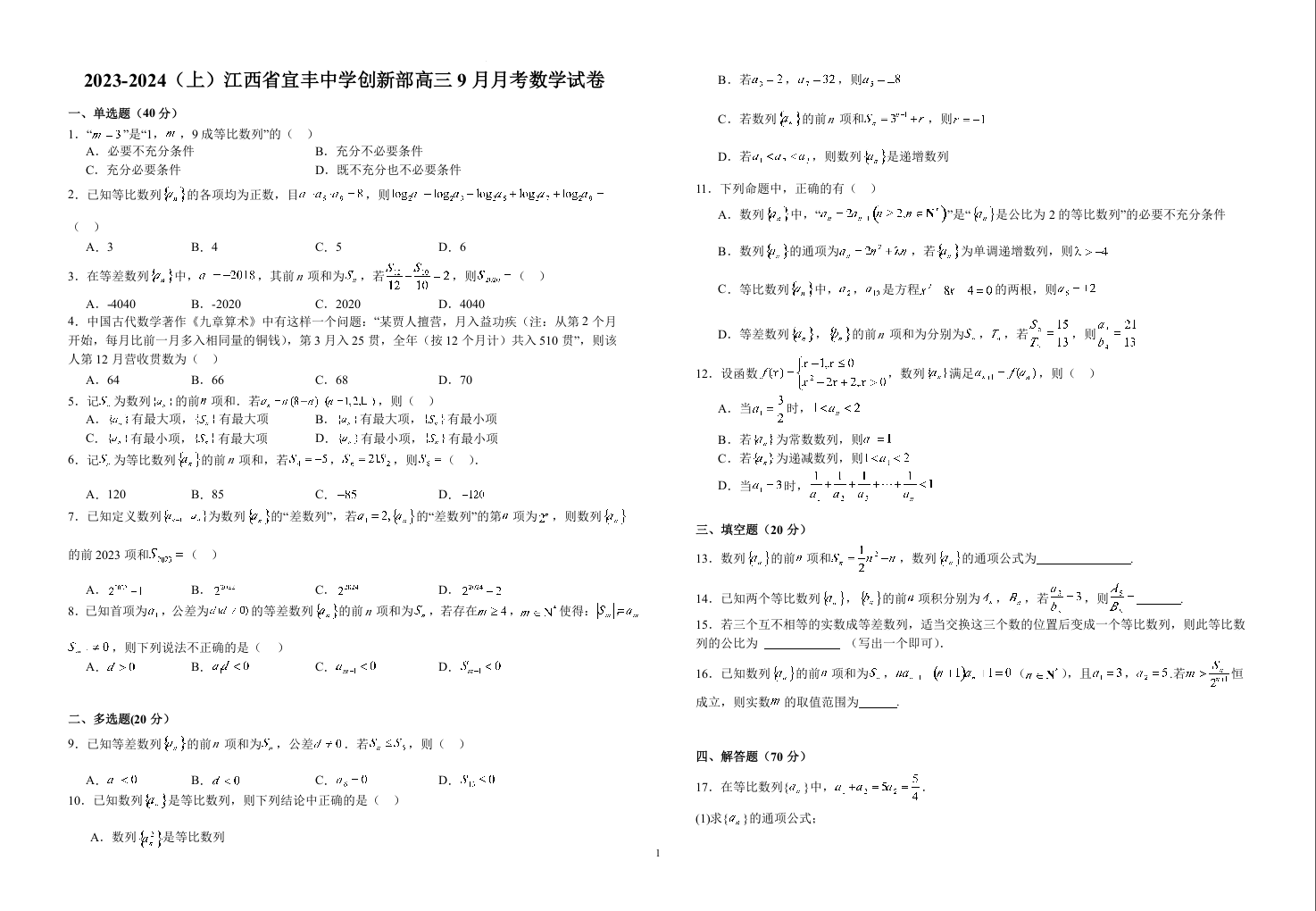 江西省宜春市宜丰县宜丰中学2023-2024学年高三上学期9月月考 数学试题