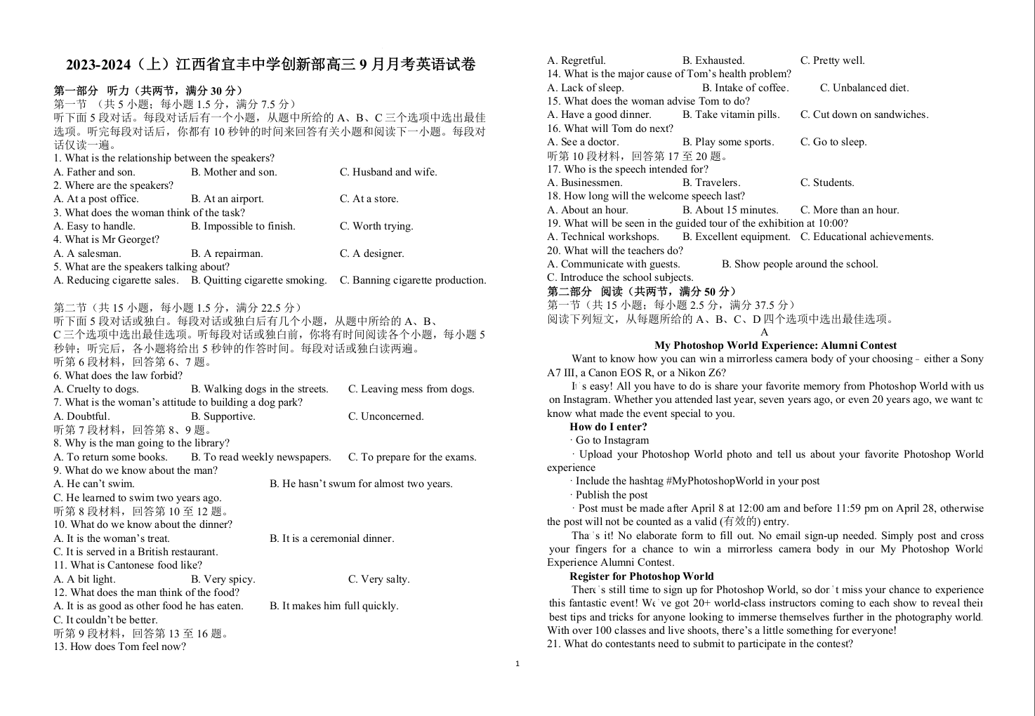 江西省宜春市宜丰县宜丰中学2023-2024学年高三上学期9月月考 英语试题