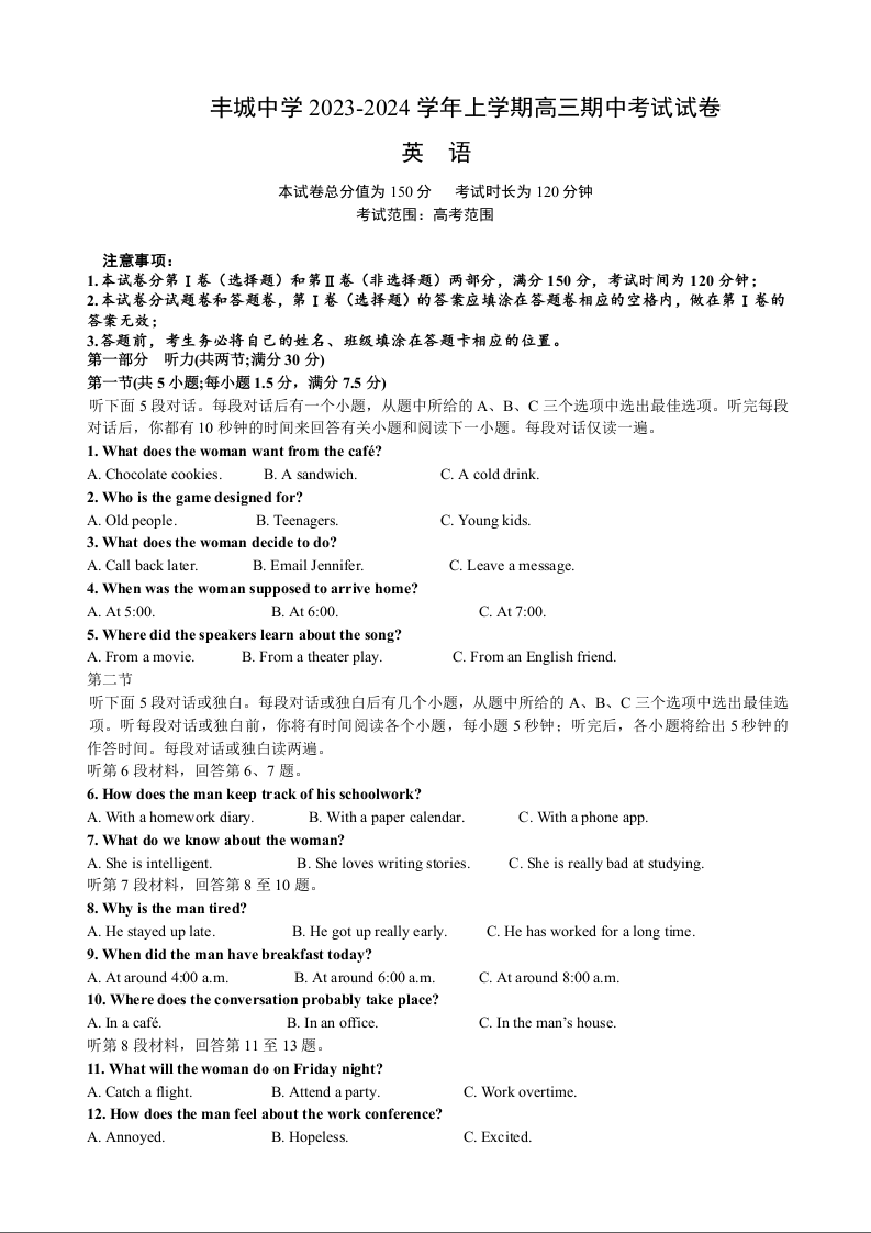 江西省宜春市丰城中学2023-2024学年高三上学期期中考试 英语
