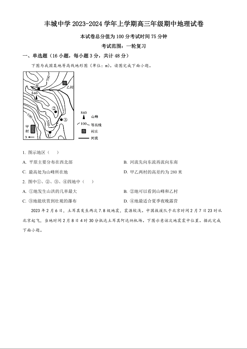 江西省宜春市丰城中学2023-2024学年高三上学期期中考试 地理