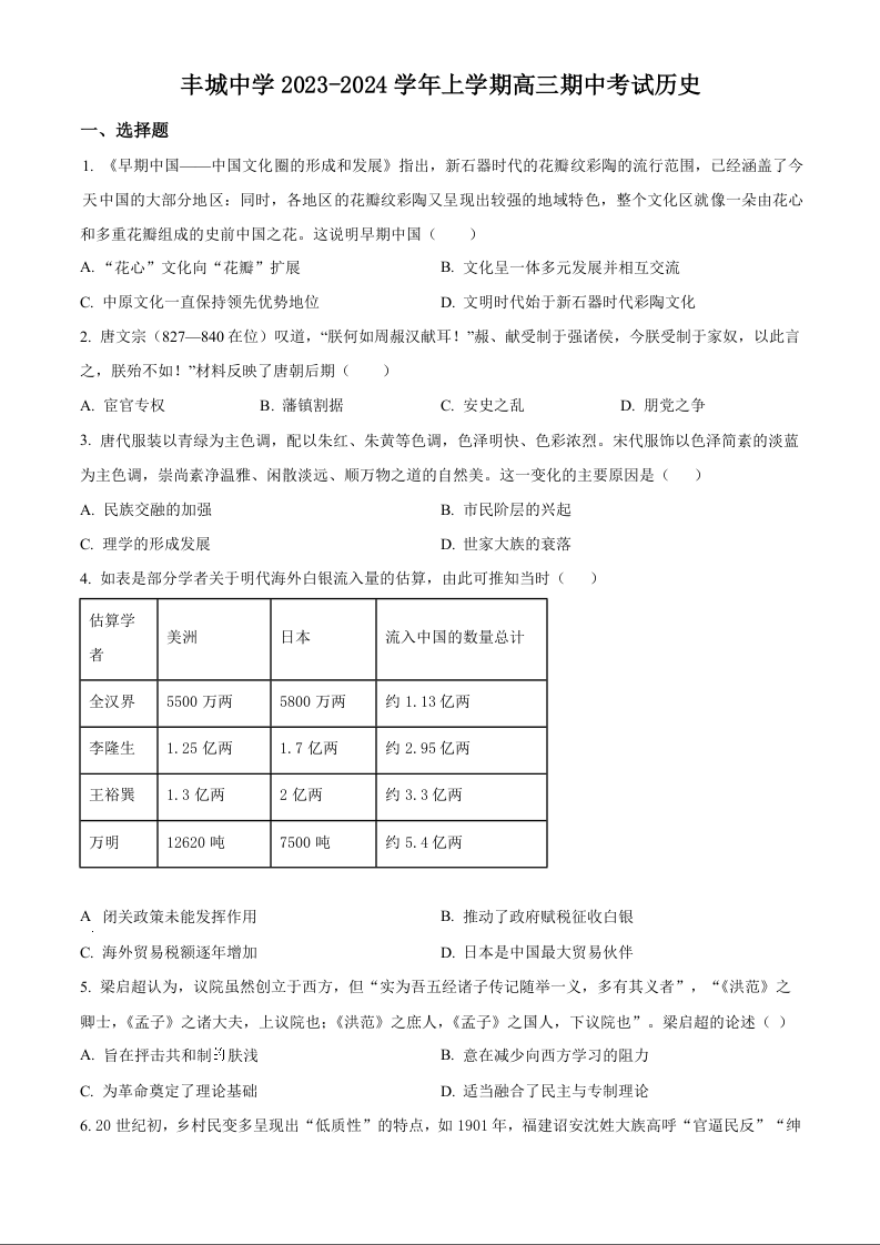 江西省宜春市丰城中学2023-2024学年高三上学期期中考试 历史