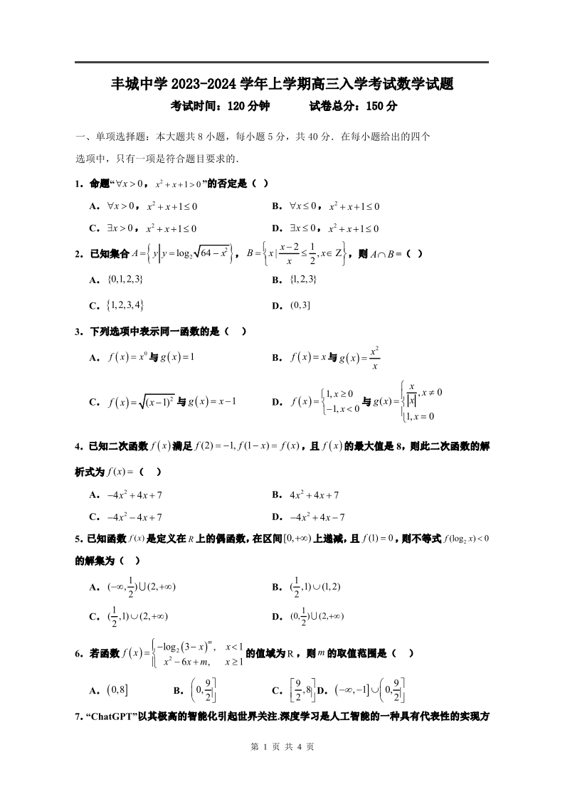 江西省丰城中学2023-2024学年高三上学期开学考试 数学
