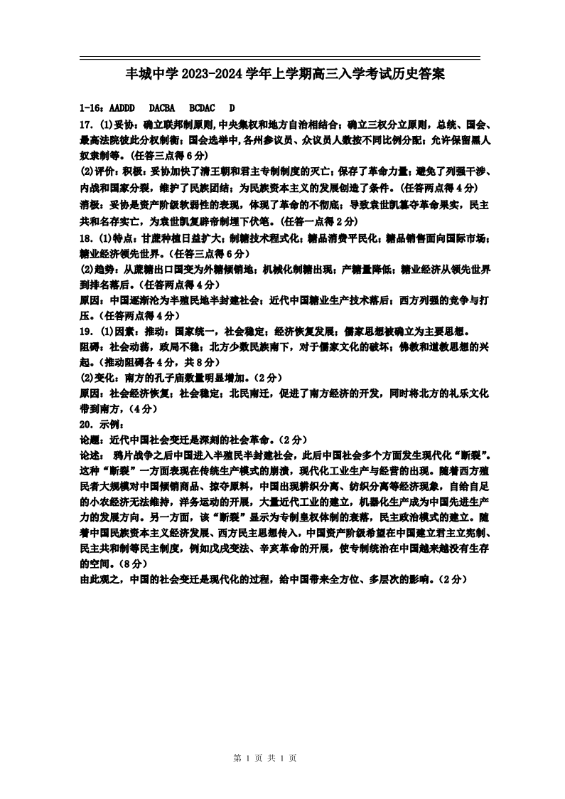 江西省丰城中学2023-2024学年高三上学期开学考试 历史答案