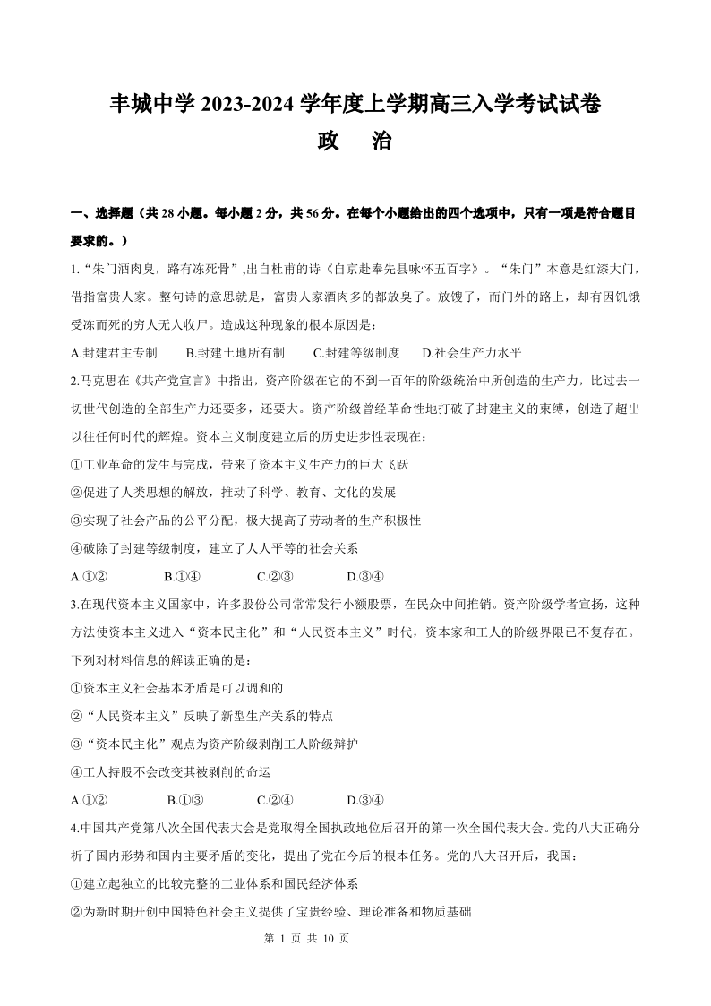 江西省丰城中学2023-2024学年高三上学期开学考试 政治
