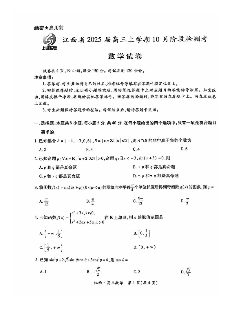 江西省稳派智慧上进联考2025届高三10月联考+数学