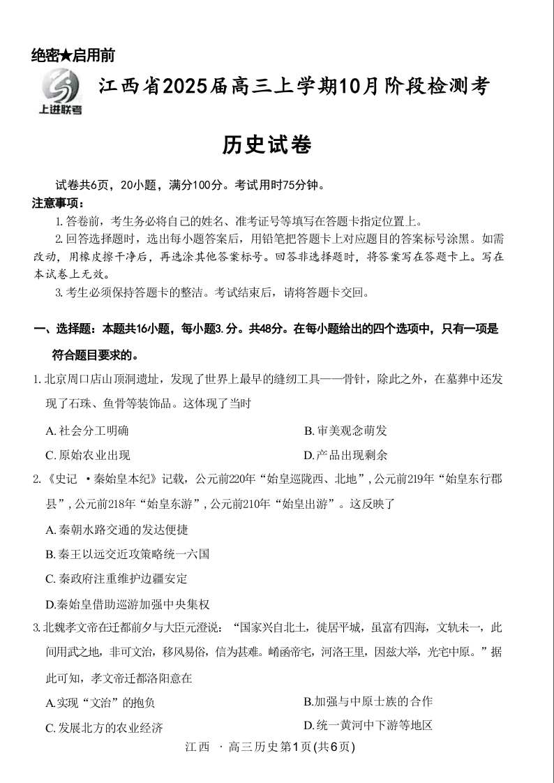 江西省稳派智慧上进联考2025届高三10月联考+历史