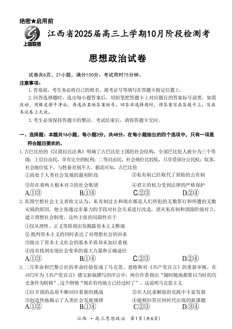 江西省稳派智慧上进联考2025届高三10月联考+政治