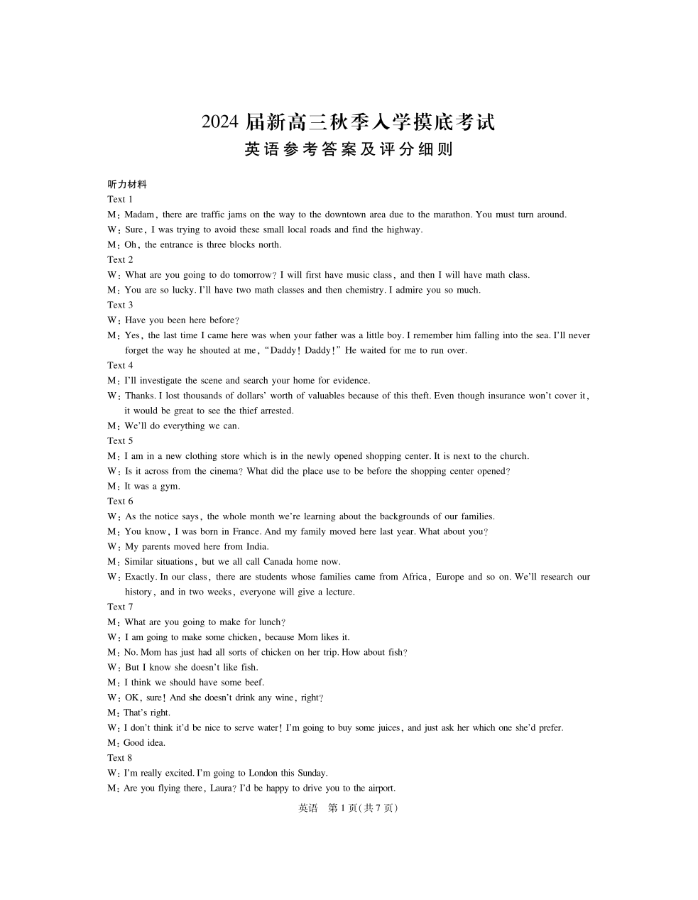 江西省稳派上进教育2024届高三上学期8月入学摸底考试 英语答案
