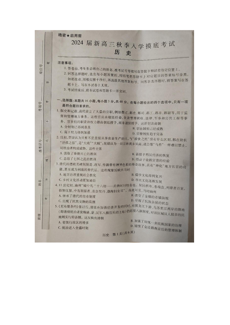 江西省稳派上进教育2024届高三上学期8月入学摸底考试 历史