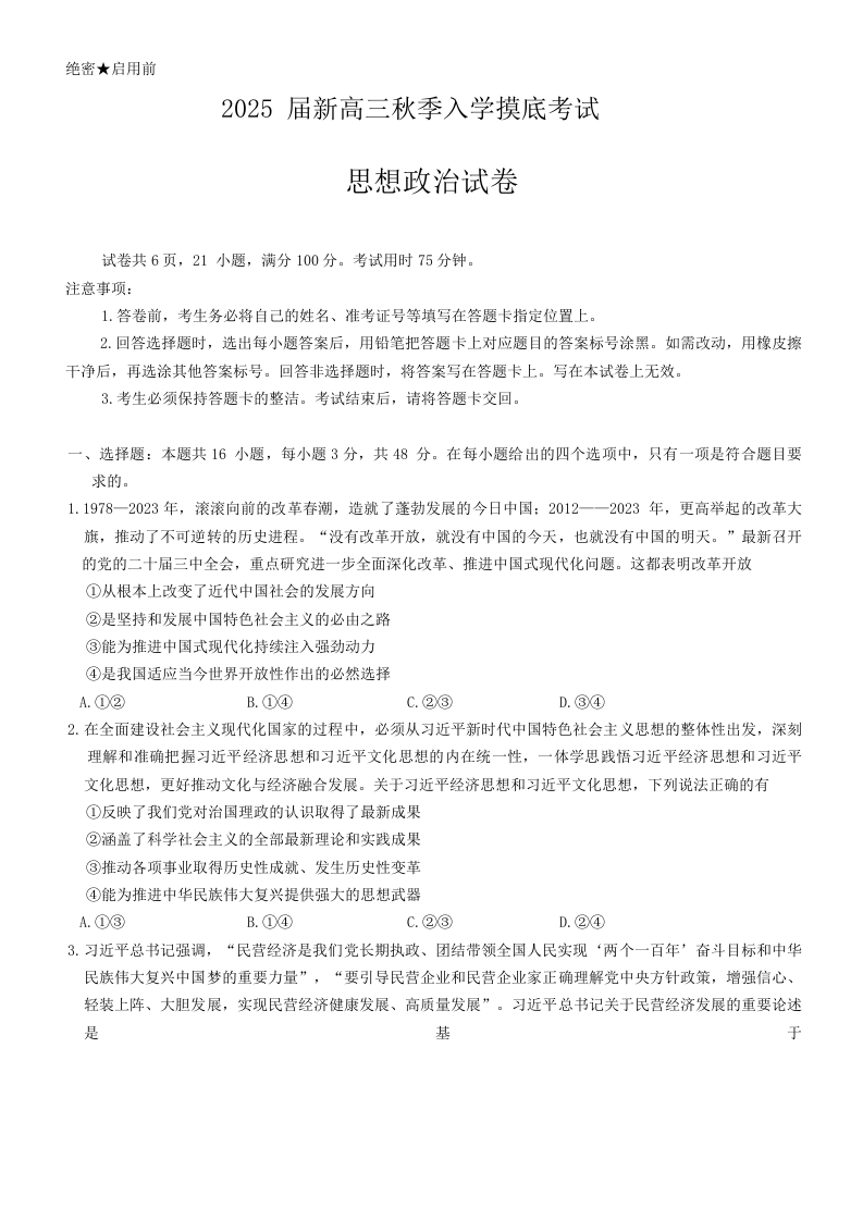 江西省稳派上进2025届新高三秋季入学摸底考试+政治