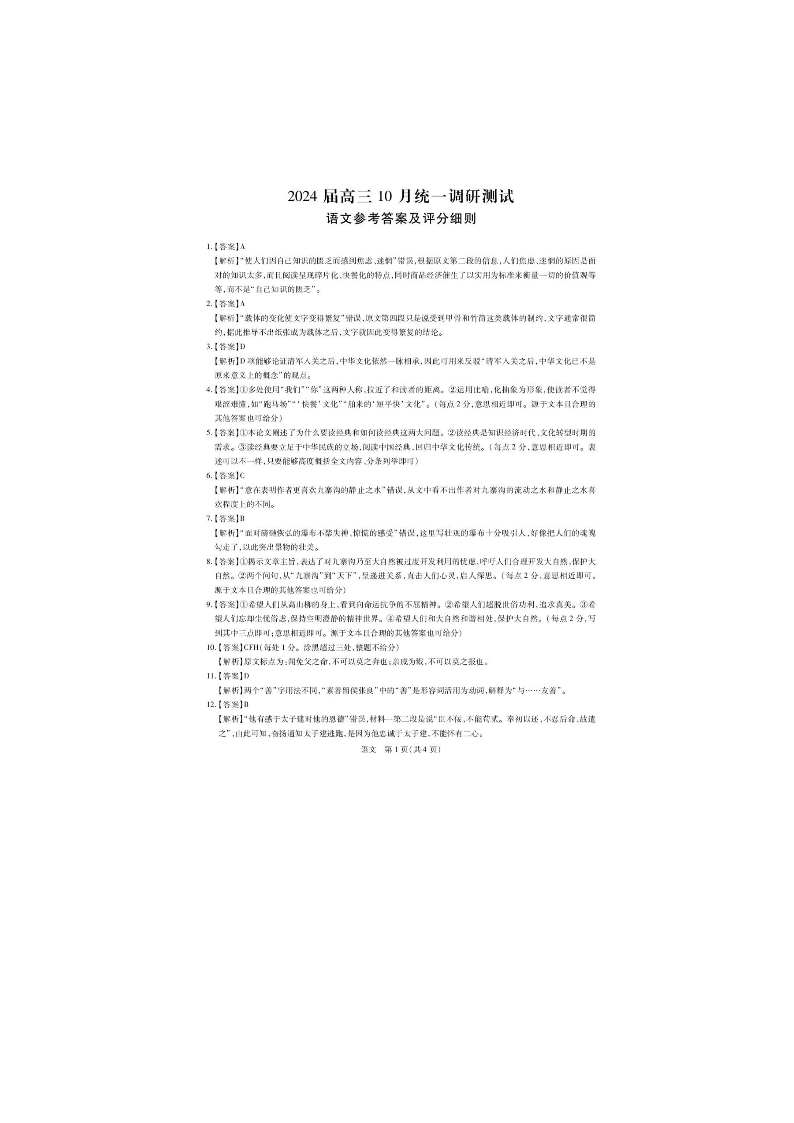 江西省稳派联考2023-2024学年高三上学期10月统一调研测试 语文答案